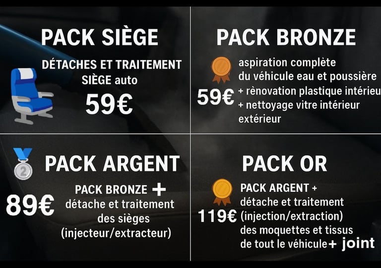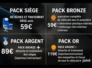 Pack auto intérieur : Bronze 59€ - Argent 89€ - Or 119€ - Rénovation siège auto 59€